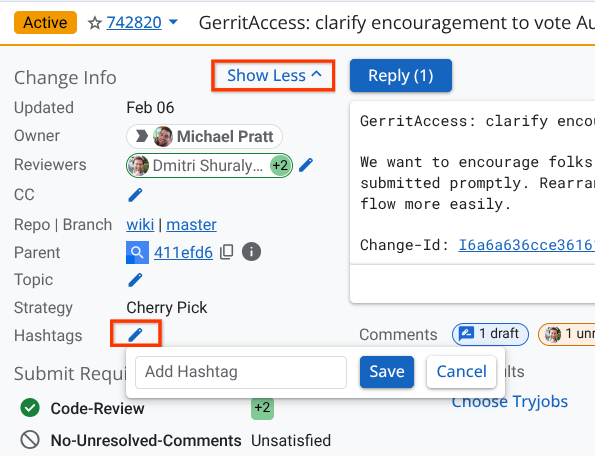 Before a CL can be submitted, it must meet several Submit Requirements, which enforce our code review guidelines. Gerrit displays the satisfied and unsatisfied submit requirements in the “Submit Requirements” section in the upper left corner of the CL page. Hovering over each requirement displays additional information about the requirement.